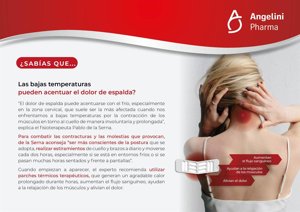 El dolor de espalda puede acentuarse con el frío, especialmente en la zona cervical, que suele ser la más afectada cuando hay que enfrentarse a bajas temperaturas por la contracción de los músculos en torno al cuello de manera involuntaria y prolongada. Pablo de la Serna, fisioterapeuta y experto en terapia de calor explica que “en casos extremos, estas molestias y el dolor provocado por las contracturas pueden llegar a reflejarse también en dorsales y lumbares, además de en otras zonas del cuerpo”