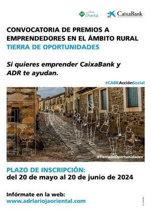 CaixaBank y ADR La Rioja Oriental han abierto esta semana la convocatoria de premios Tierra de Oportunidades dirigida a los emprededores de los 36 municipios de la comunidad autónoma de La Rioja ubicados los valles del Jubera, Ocón, Cidacos, Alhama- Linares y Ebro.