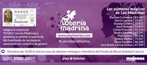 El Fondo de Becas Fiscal Soledad Cazorla Prieto ha lanzado la novena edición de la Lotería de la Madrina, un proyecto promovido por Fundación Mujeres, Playloterias.com y Loterías Solidarias del Mundo para visibilizar la situación de niños huérfanos por violencia machista a través del sorteo de El Niño, que se celebra el 6 de enero.