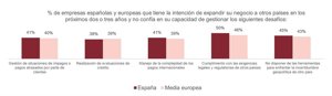 Dentro de este grupo de compañías que buscan internacionalizarse, el 41% no confía en su capacidad para gestionar correctamente en otros mercados situaciones de impagos o pagos atrasados por parte de clientes. Una inquietud compartida a nivel europeo, donde el 40% de las organizaciones con deseo de dar el salto fuera de su país, está de acuerdo con esta afirmación.