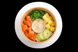 •**Poke Maui: salmón marinado en cubos con piña dulce, arroz suave, alga wakame crujiente y pepino refrescante, bañado en una sabrosa salsa poke.