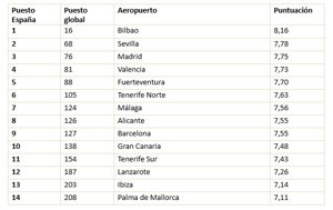 El primer aeropuerto español que aparece en el ranking de Airhelp es el de Bilbao. Ocupa la posición 16 en la clasificación mundial y, además, se convierte en el segundo mejor aeropuerto de Europa. Obtiene una puntuación general de 8,16 puntos, con un 8,3 en puntualidad, 8 en valoración de los clientes y un 7,7 en espacios de ocio como tiendas y restaurantes.