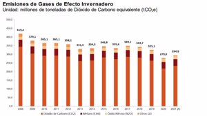 MADRID, 15 (EUROPA PRESS) Las emisiones de gases de efecto invernadero (GEI) de la economía española aumentaron hasta en 2021 hasta las 294,9 millones de